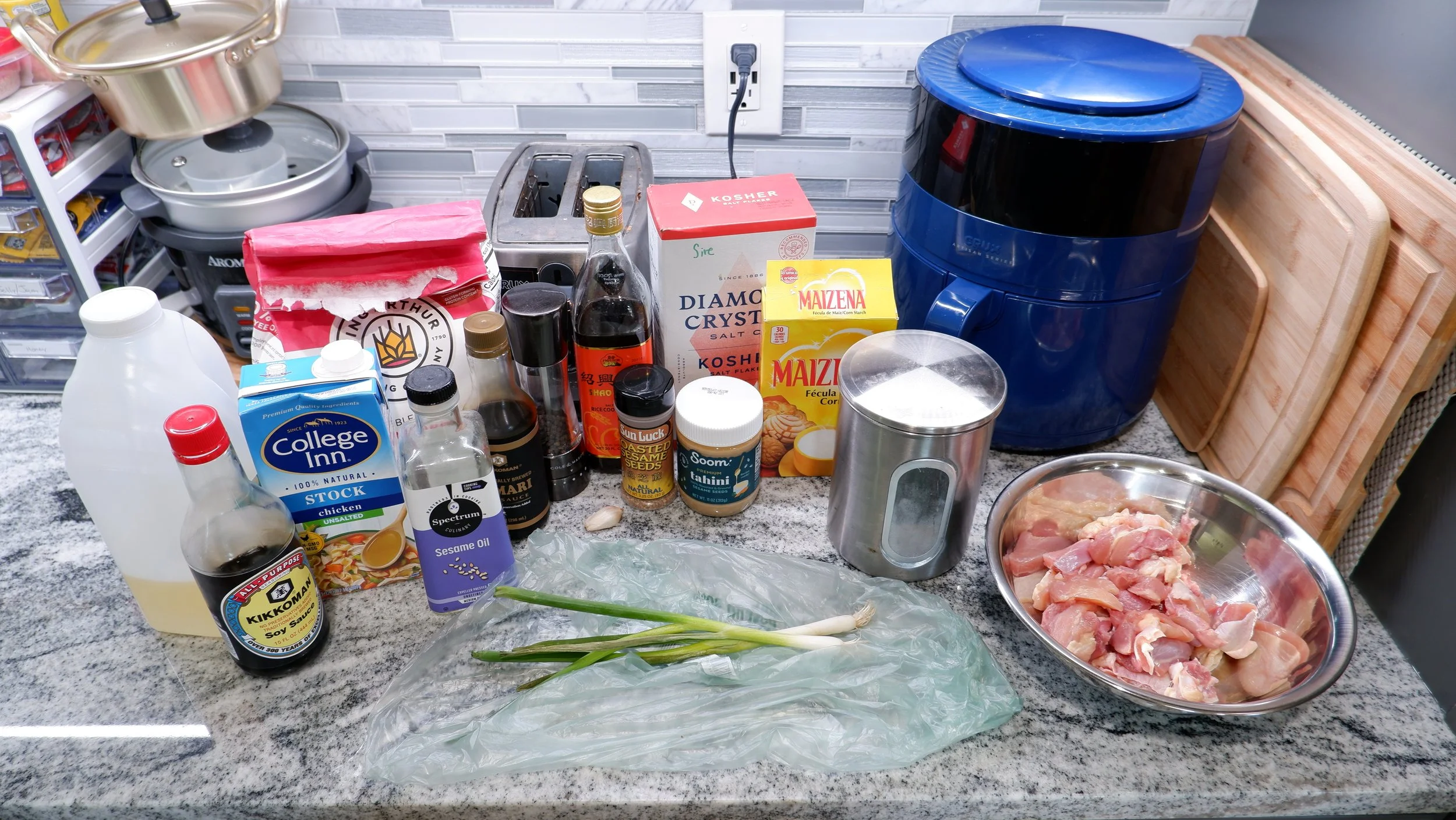 I heated my wok over medium heat and added the oil and garlic to cook for a few minutes before adding the shao xing wine. This was followed by the prepared sauce from a couple steps before. Once it reached a simmer, I added a cornstarch slurry and let it thicken before adding the chicken and green onion to the wok to coat. The chicken was done at this point.