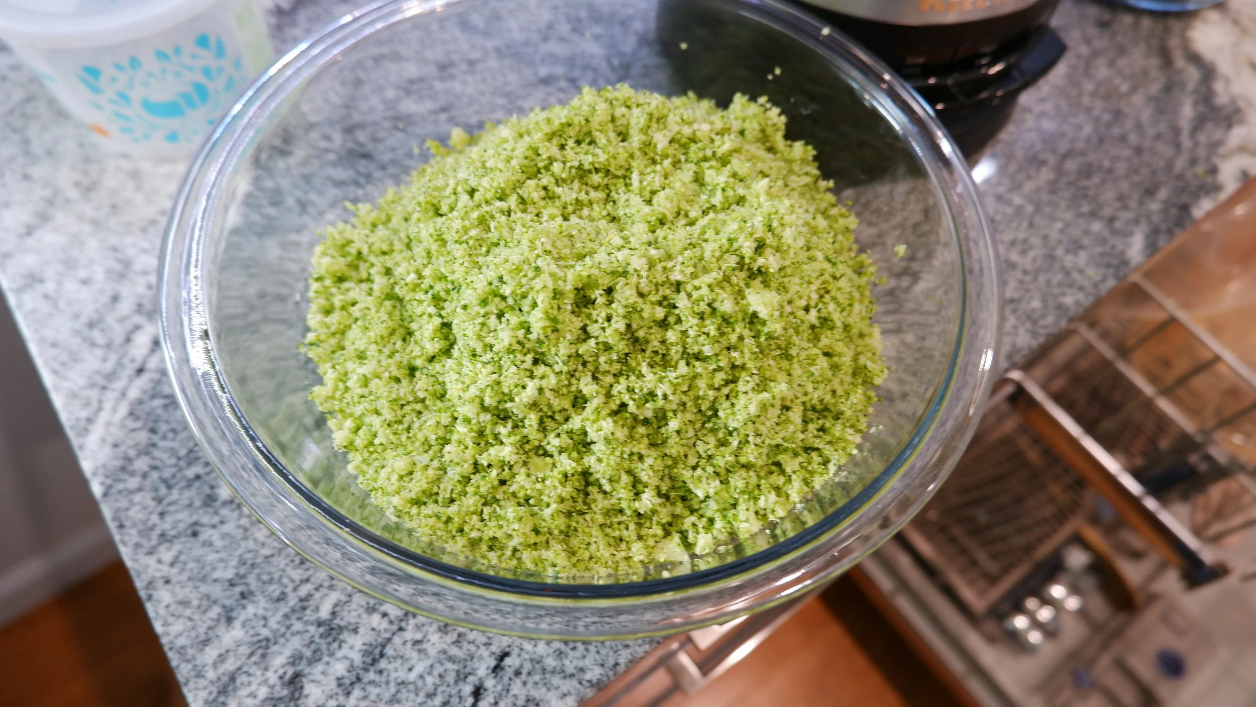Once the broccoli is chopped, it needs to be broken down into smaller pieces. You may be able to fit all of your broccoli into your food processor if it’s large enough, but it’s probably best to process it in at least two batches until it’s all evenly broken down. The broccoli has a tendency to stick to the bottom of the food processor, so the broccoli on top has a harder time reaching the blades.