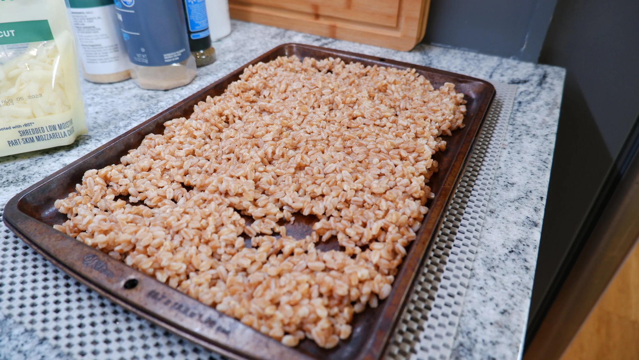 Before I started working on breaking down the broccoli, I got a pot of water on the stove to come to a boil for the farro. Once it was boiling, I added the farro and cooked it for about 33 minutes before transferring it to a pan to cool. This step can be done while you do the previous and following steps.