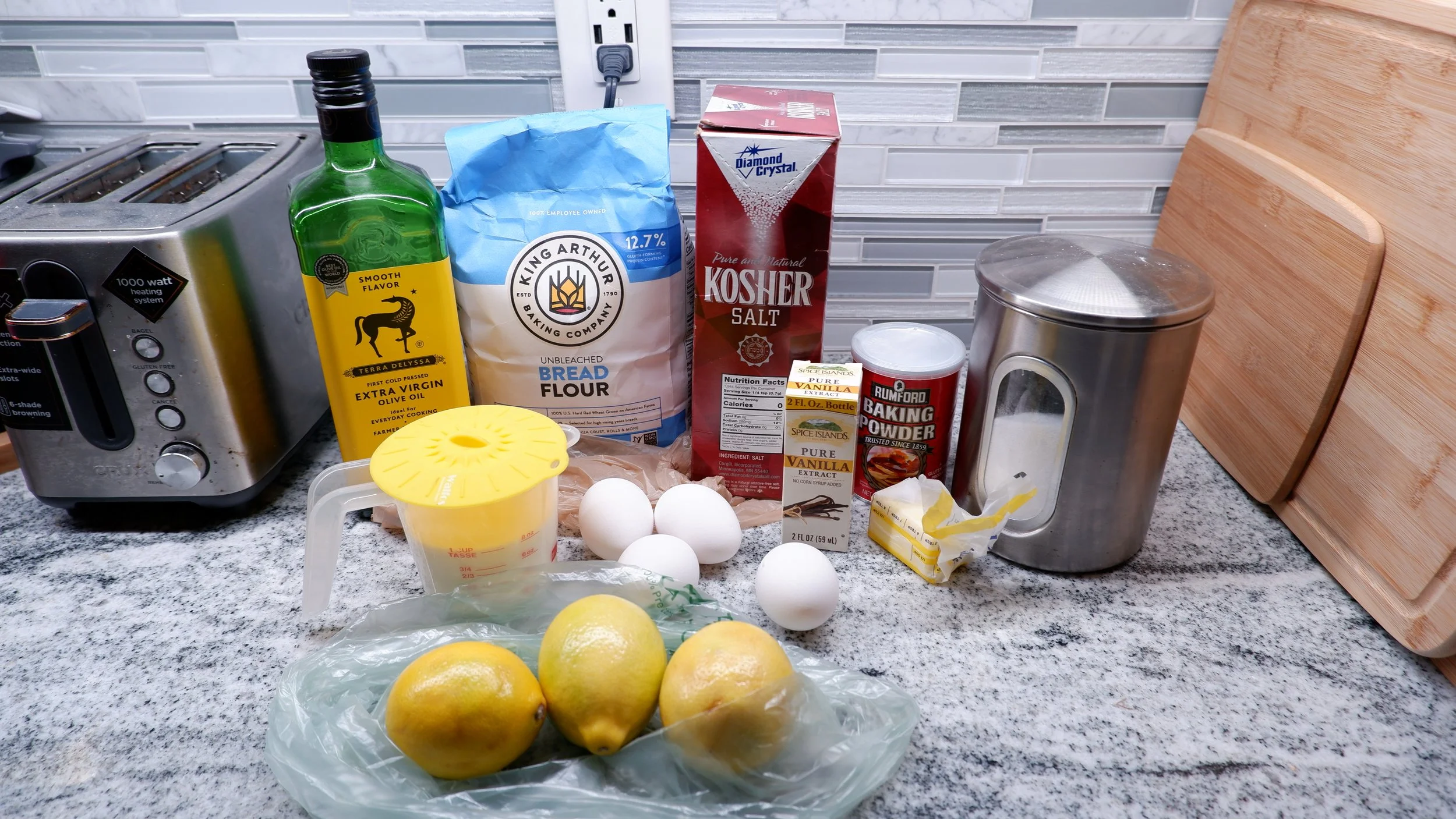The key ingredients here I think are the Meyer lemons and olive oil. I know not every grocery store will have Meyer lemons, which is why this recipe looses a point in ingredient availability. The recipe does ay that you can use regular lemons instead with a tweak of the amount of sugar used. The olive oil us used in the glaze, so you will want one that you like the flavor of. Other than that, the rest of the ingredients are pretty standard. I forgot to put the baking soda in the picture.