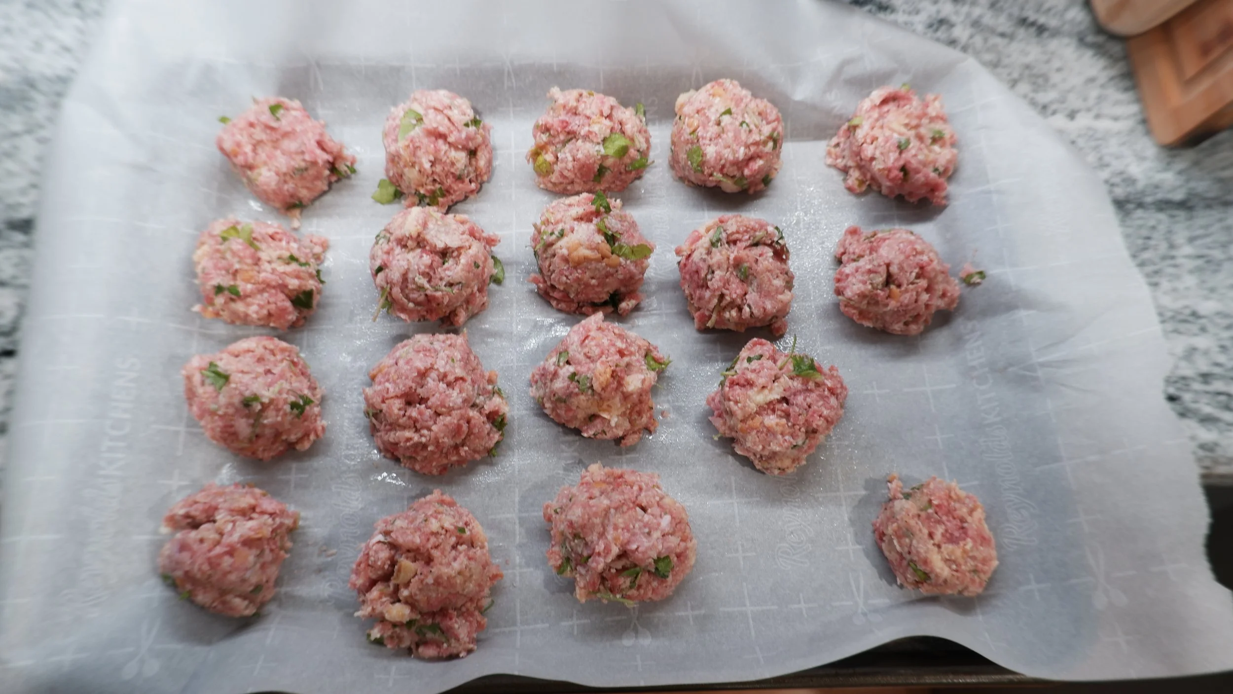 I added all the ingredients into a bowl and mixed them until just combined. I then used a 1/4 cup measure and spoon to form the meat into balls and place them on a baking sheet lined with oiled parchment paper.