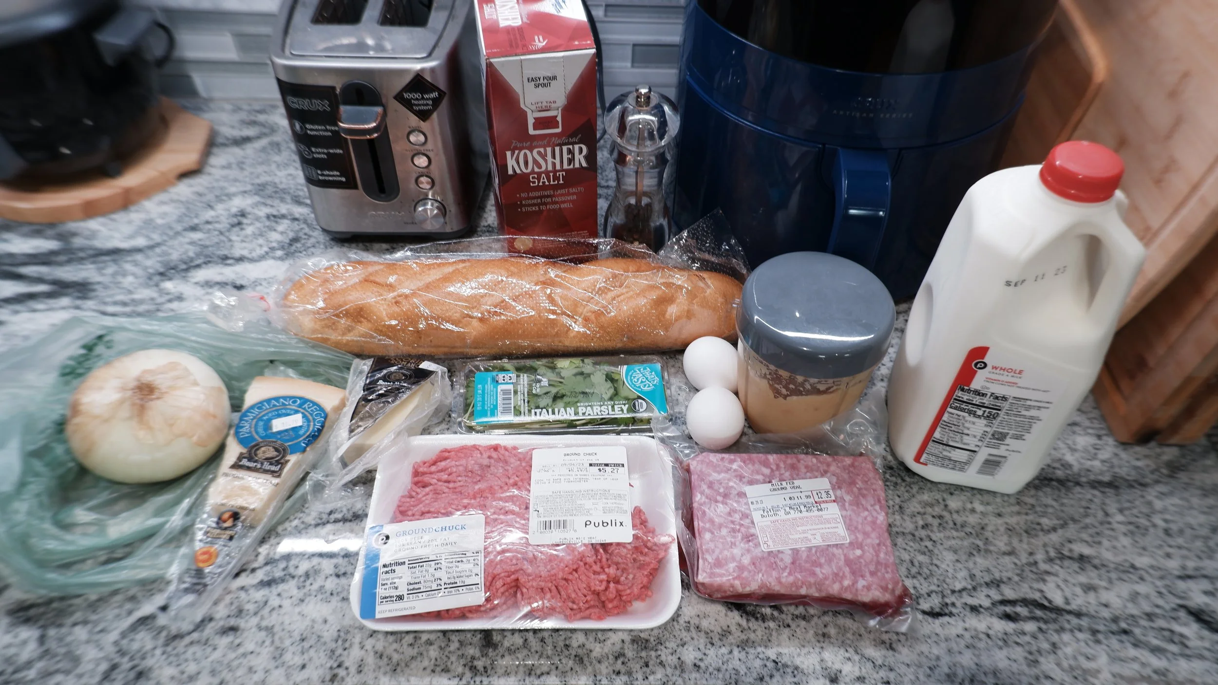 I added a cup of milk to my chopped up bread and let it soak for 15 minutes. In the mean time, I pureed the onion and squeezed out the water through a kitchen towel. I also separated the beef and veal into equal 3/4 lb portions, as the packs they came in were 1 lb. Once the bread had been soaked, I squeezed the excess milk out through another kitchen towel.