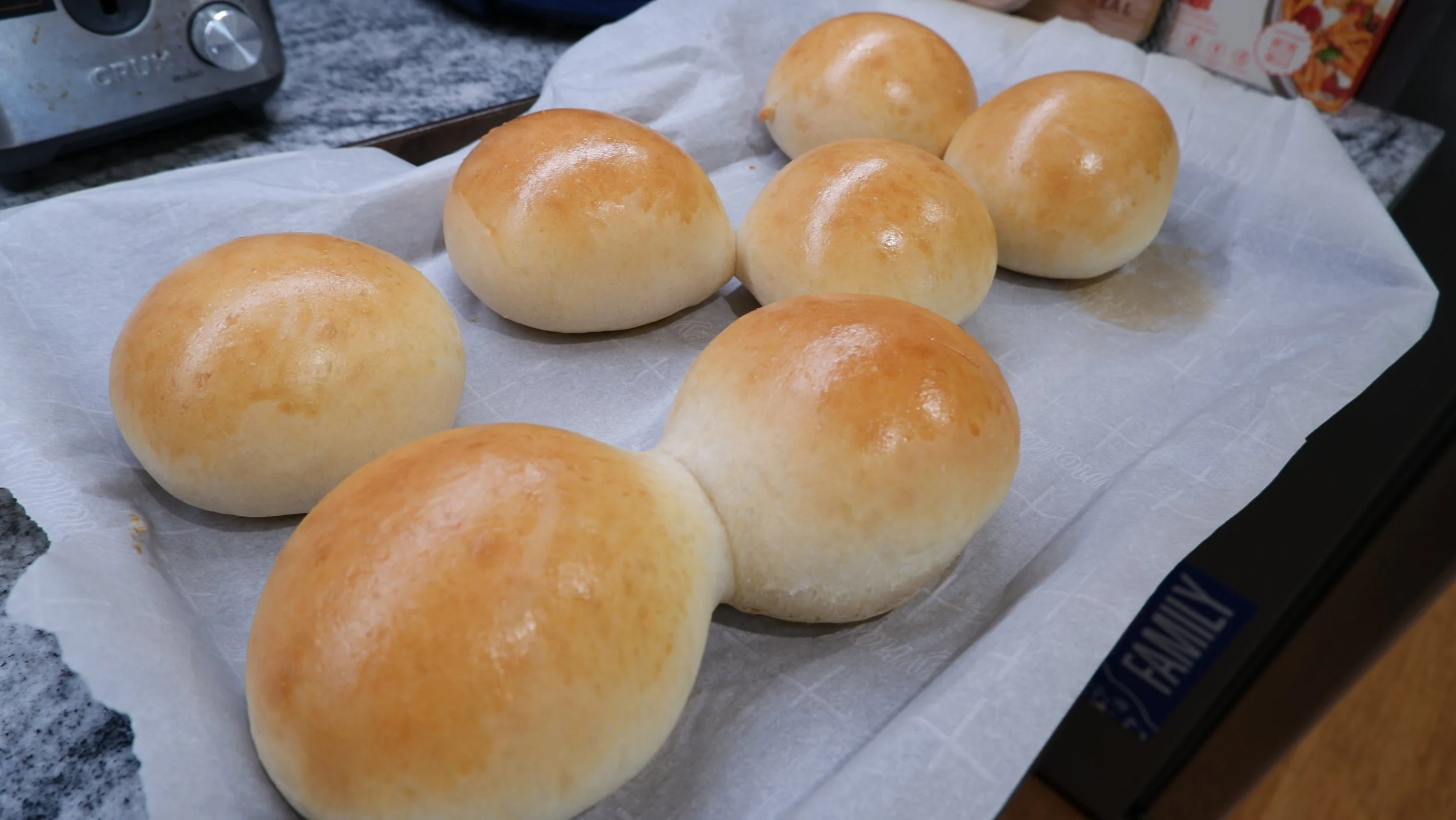 I transferred the dough to a greased bowl and covered with lightly greased plastic wrap. I let it rise for an hour, as it had just about doubled in size. I punched down the dough to release the gas and used a floured surface to split the dough into 7 evenly sized dough balls. The dough balls were arranged on a parchment lined baking sheet.