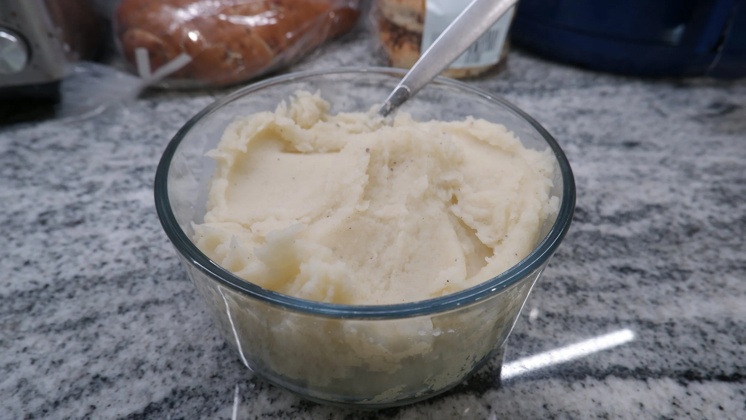 I mixed the garlic vinegar mixture into the potatoes, followed by the olive oil. At that point the spread was pretty thick, so I got some warm water from the sink, added a little potato starch, and added it to the spread until it was loosened and smooth. Finally, I seasoned it to taste with salt and pepper.